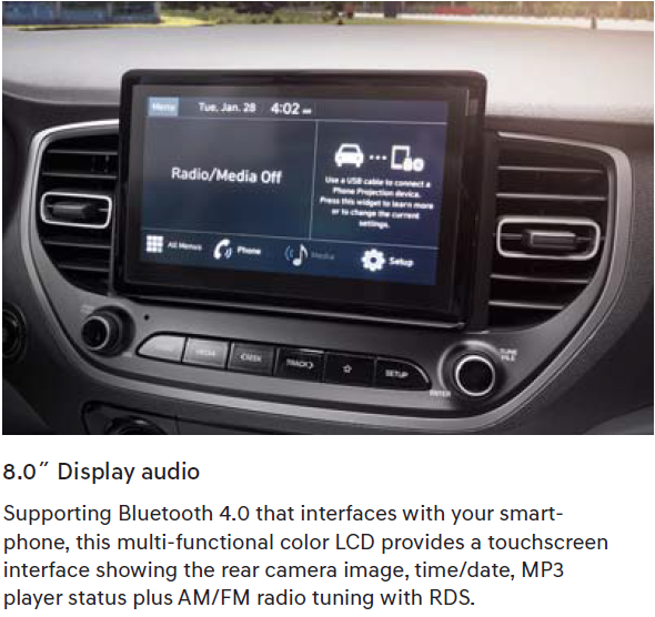 Accent’s well-appointed two-tone cabin provides the perfect space to relax and to be productive too. Once you shut the doors, the peace and quiet will amaze you because Accent is exceptionally well-insulated from road and wind noise. And to keep you well connected and productive while you’re on the road, the 8-inch multimedia display offers full support for smartphone connectivity and a lot more through a touchscreen display with easy-to-navigate menus. The colorful dials on the instrument are razor-sharp, precise and easy to read thanks to digital display technology.