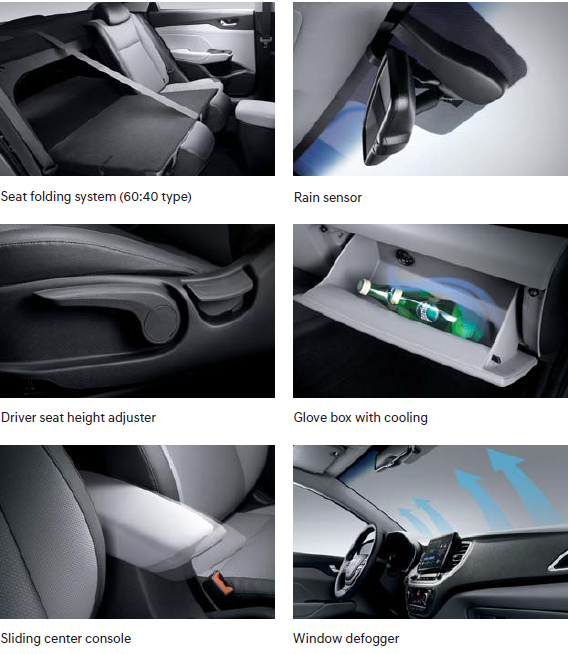 Accent’s well-appointed two-tone cabin provides the perfect space to relax and to be productive too. Once you shut the doors, the peace and quiet will amaze you because Accent is exceptionally well-insulated from road and wind noise. And to keep you well connected and productive while you’re on the road, the 8-inch multimedia display offers full support for smartphone connectivity and a lot more through a touchscreen display with easy-to-navigate menus. The colorful dials on the instrument are razor-sharp, precise and easy to read thanks to digital display technology.