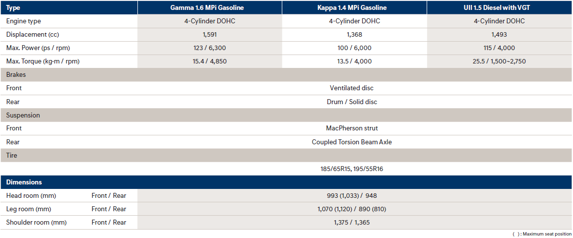 Accent comes with a choice of powertrains to suit personal requirements. Whichever you specify, you can always depend on Accent to deliver impressive and reliable performance. Accent adopts tried and true technologies like variable intake systems that let the engines adjust their breathing to power demand, six-speed transmissions and multi-point injection for maximum fuel economy.